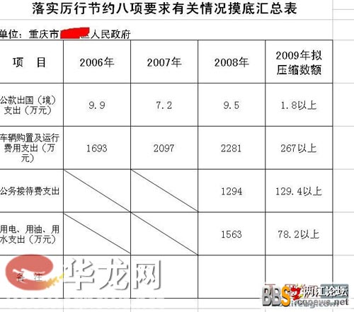 網(wǎng)友曝出的這份某區(qū)“落實(shí)厲行節(jié)約八項(xiàng)要求有關(guān)情況摸底匯總表”顯示,2006年,重慶某區(qū)政府在公車購置及運(yùn)行費(fèi)用一項(xiàng)上花掉了1693萬元,此后兩年開銷不見回落,至2008年已高達(dá)2281萬元。今年,政府厲行節(jié)約八項(xiàng)要求,“勒緊公款腰包”,公車一項(xiàng)亦擬花2000萬左右。除此之外,該區(qū)政府去年于公款出國(境)支出9.5萬元,公務(wù)接待用了1294萬元,用電、用水、用油花了1563萬。如此巨額公費(fèi)開支,令人震驚。