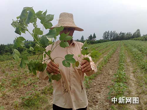 中新網(wǎng)宜昌7月11日電 (記者 劉良偉 上官純青) 棉花是湖北枝江市百里洲鎮(zhèn)的支柱產(chǎn)業(yè),時值棉花開花季節(jié),該鎮(zhèn)100余戶棉農(nóng)高興不起來,大片棉花出現(xiàn)黃葉且不長個頭。據(jù)枝江市農(nóng)業(yè)行政執(zhí)法大隊的統(tǒng)計,該鎮(zhèn)200余畝棉花絕收,800余畝棉花面臨欠收。據(jù)初步調(diào)查,疑與棉農(nóng)使用一種除草劑有關,目前生產(chǎn)廠家已趕赴枝江處理此事。