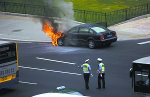 今天9時(shí)30分,(北京市)建國(guó)門內(nèi)大街由東向西方向,一輛行駛中的黑色帕薩特車突然自燃,所幸無(wú)人受傷。