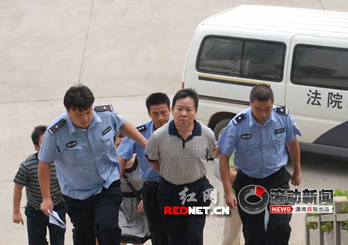 8日上午9時(shí)40分,龍國(guó)華被法警押送到湘潭市中院第一審判庭的被告席上,開(kāi)始接受審判。