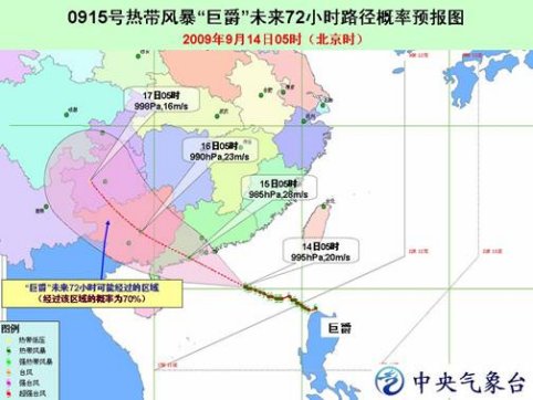 預(yù)計(jì),風(fēng)暴中心將以每小時(shí)25公里左右的速度向西偏北方向移動(dòng),逐漸向廣東中西部一帶沿?拷,強(qiáng)度逐漸加強(qiáng),并將于14日夜間到15日上午在廣東珠海到湛江一帶沿海登陸。