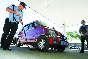 車子駛?cè)霗z查站后,絕大多數(shù)司機會立即遞出駕照、行駛本和身份證。如果車輛和人員沒有任何可疑之處,檢查時間極為短暫。如民警認(rèn)為必要,會要求司機下車,打開后備箱,或者使用手持安檢儀、身份證識別儀、車底檢查鏡,對車輛和人員進(jìn)行較細(xì)致的檢查!鞍讖R檢查站每天可檢查17000輛車,6萬多人。”檢查站站長齊躍警官告訴記者,當(dāng)發(fā)現(xiàn)有可疑車輛,民警會要求該車駛出車道,在旁邊空場上檢查。發(fā)現(xiàn)可疑人員或需要重點檢查的人員之后,會將他們帶入候檢大廳,使用大廳里的安檢門、X光機等設(shè)備進(jìn)行檢查。
