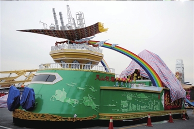 新疆彩車(chē)的設(shè)計(jì)者是塔吉克族同胞阿迪夏,他短短一周內(nèi)完成的創(chuàng)意設(shè)計(jì),在評(píng)審時(shí)從新疆8家設(shè)計(jì)單位提供的13種設(shè)計(jì)方案中脫穎而出。