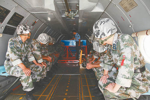執(zhí)行空中撒播催化劑任務(wù)的是空降兵某團(tuán)的特種兵們,他們?cè)啻螐倪@種型號(hào)的運(yùn)輸機(jī)上練習(xí)跳傘,但這次的任務(wù)是在規(guī)定時(shí)間內(nèi),快速將消云減雨的催化劑播撒完畢。