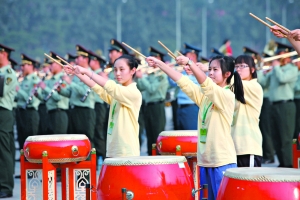 昨日下午3點(diǎn)開(kāi)始,聯(lián)合軍樂(lè)團(tuán)和合唱團(tuán)、民族打擊樂(lè)團(tuán)共4000余人在聯(lián)合軍樂(lè)團(tuán)駐地進(jìn)行了合練。記者在現(xiàn)場(chǎng)看到,廣場(chǎng)樂(lè)聲悠揚(yáng),氣氛熱烈。一些大學(xué)生合唱團(tuán)成員從各自高校乘大巴趕至郊外,有些學(xué)生暈車剛吐完就上場(chǎng)加入合練。