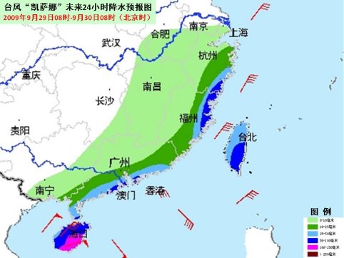 受“凱薩娜”及其外圍云系的影響,29日白天到夜間,南海大部海面、北部灣海面、瓊州海峽、海南沿海、廣西沿海將有7~9級(jí)大風(fēng),“凱薩娜”中心經(jīng)過(guò)的附近海面或地區(qū)的風(fēng)力將有10~13級(jí)大風(fēng),陣風(fēng)可達(dá)14~16級(jí);巴士海峽、巴林塘海峽、臺(tái)灣海峽、臺(tái)灣以東海面、廣東沿海、福建中南部沿海也將有6~7級(jí)大風(fēng),陣風(fēng)可達(dá)8~9級(jí);浙江東南部、福建東部、臺(tái)灣、廣東南部、海南等地有大雨或暴雨,海南南部的局部地區(qū)有大暴雨或特大暴雨。