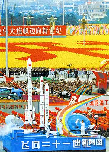 在新中國六十周年國慶大典中,中國航天科技集團(tuán)公司所屬中國運(yùn)載火箭技術(shù)研究院提供的特種車將確保閱兵武器裝備穩(wěn)妥可靠;正在軌運(yùn)行的“風(fēng)云”氣象衛(wèi)星和中國航天科技集團(tuán)公司所屬航天動力技術(shù)研究院提供的增雨防雹火箭,將為國慶當(dāng)天氣象提供保障與服務(wù);中國航天科技集團(tuán)公司所屬中國空間技術(shù)研究院利用航天特種技術(shù)制作的六十只“中國紅”氦氣宮燈已懸浮于天安門廣場兩側(cè),為閱兵盛典和國慶假日營造祥和、喜慶氣氛。
