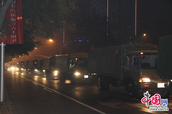 雨后的長(zhǎng)安街一片清新,萬(wàn)達(dá)購(gòu)物廣場(chǎng)、雕塑公園花壇等照明燈的點(diǎn)綴,讓薄霧下的北京格外妖嬈。期間,一列車(chē)隊(duì)從西五環(huán)方向緩緩駛來(lái),這是為參加今天上午國(guó)慶閱兵的武警某部隊(duì)。雖然是夜間行車(chē),但是車(chē)上的小戰(zhàn)士情緒很高,一路上有說(shuō)有笑。(北京時(shí)間1時(shí)45分 記者馮竹長(zhǎng)安街報(bào)道)