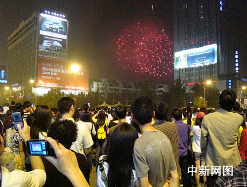 當(dāng)晚8時(shí),早已準(zhǔn)備就緒的禮花彈在成都市區(qū)內(nèi)6個(gè)燃放點(diǎn)同時(shí)升空,綻放的焰火無比璀璨,給成都夜空披上了一件華麗的袍子。成都民眾紛紛走出家門,來到自家的樓頂或聚集在鬧市區(qū),共賞了這臺(tái)慶祝新中國(guó)60華誕的焰火“盛筵”。