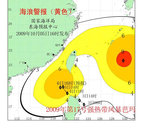 受今年第17號強熱帶風(fēng)暴“芭瑪”影響,預(yù)計今天夜間到明天白天:福建沿海和浙江南部沿海仍有2.8米到3.9米的大浪;臺灣海峽仍有4.0米到6.0米的巨到狂浪;東海南部仍有3.0米到4.5米的大到巨浪;東海北部將出現(xiàn)2.5米到3.5米的大浪;東海東部將出現(xiàn)3.5米到5.5米的大到巨狼。