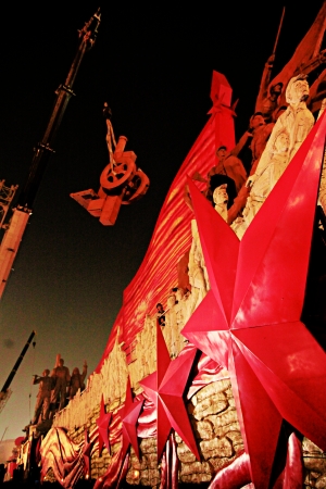 昨夜,天津彩車的工作人員正在進行拆解作業(yè),旁邊北京彩車的拆解即將開始。昨晚22時許,天安門廣場,60輛彩車的燈光依次熄滅,游人漸散。彩車轉(zhuǎn)場工作全面啟動。至今晨5時,國慶60周年群眾游行中的60輛彩車將全部轉(zhuǎn)移到朝陽體育中心。相關負責人介紹說,其中33輛彩車將返回原省份。本報記者 周曉東 攝