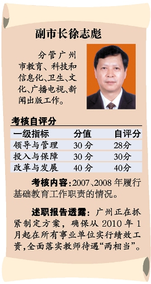 徐志彪在自評分說明中,給自己這兩年的工作成績都打了98分,并在述職報告中表示,廣州正在抓緊制定方案,確保從2010年1月起在所有事業(yè)單位實行績效工資,全面落實教師待遇“兩相當(dāng)”。