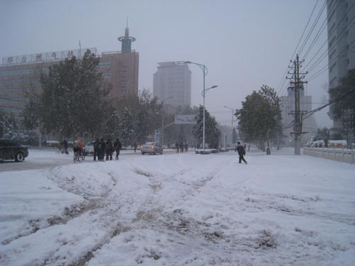 石家莊市區(qū)大雪將部分樹枝壓斷,公共交通嚴重受阻,路上車輛稀少,許多市民只有提前步行上班或送孩子上學。