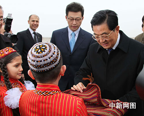 土庫(kù)曼斯坦政府官員和當(dāng)?shù)厝A僑華人趕到機(jī)場(chǎng)迎接。兩名土庫(kù)曼兒童分別向胡錦濤獻(xiàn)花和面包,請(qǐng)胡錦濤掰下兩小塊面包品嘗。