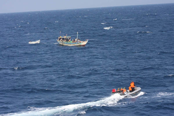 為既能提高護(hù)航效率,又減少兵力使用強(qiáng)度。編隊(duì)指揮組進(jìn)行了《針對海盜活動(dòng)特點(diǎn)、科學(xué)提高護(hù)航效率》的專題調(diào)研:在巡邏區(qū)增設(shè)臨時(shí)補(bǔ)給區(qū)用于應(yīng)急補(bǔ)給;護(hù)航時(shí)兩艦采用一艦護(hù)航,一艦巡邏警戒和裝備保養(yǎng)輪換休整;一艦在航線中段對另一艦進(jìn)行接力護(hù)航等方式……在護(hù)航中做到合理配置兵力、努力做到科學(xué)護(hù)航。