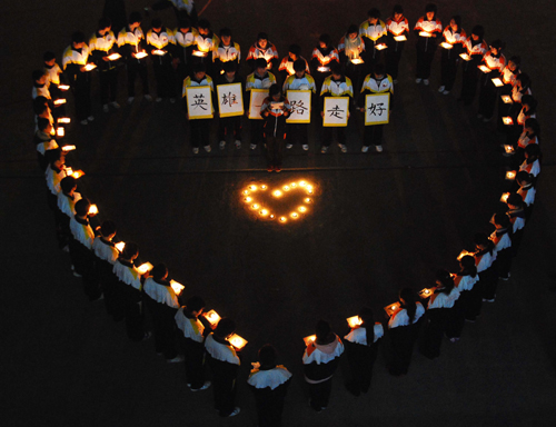 中新網(wǎng)九江一月二十日電 (胡國林)“我們在這里為你們點亮心燭,照耀你們前行的路,祝你們一路走好”,一月十九日晚七點半,在江西九江市晨光中學的操場上,綿陽班的學生郭鑫手捧蠟燭,眼含熱淚表示。當晚,五十余名綿陽班的學生點燃蠟燭為在海地地震中遇難的八名中國維和英雄和海地人民祈福。