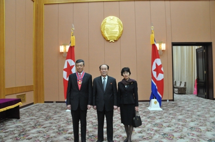 劉曉明大使夫人胡平華及中國駐朝鮮使館外交官、朝鮮最高人民會(huì)議常任委員會(huì)對(duì)外事業(yè)部長林賢輔,外務(wù)省副相金亨俊等參加授勛儀式。