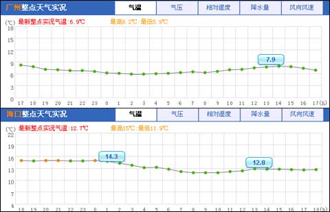 雖然時(shí)下已是“七九”,但在雨水的作用下,江淮、江南以及華南等地的氣溫卻并不高,一些地方的溫度較之前一天甚至還有降低。以廣州為例,16日14時(shí)廣州氣溫只有7.9℃,較前一天的9℃又下降了1.1℃。經(jīng)數(shù)據(jù)比對(duì),該溫度也是廣州自去年立冬以來(lái)最冷的一天。之前廣州最冷的一天是1月7日,最高氣溫8.8℃。再拿海口來(lái)說(shuō),16日02點(diǎn)的氣溫為14.3℃,爾后逐漸下滑,到了當(dāng)日14時(shí)氣溫下降至12.8℃。濕度大,溫度低,以上地區(qū)的人體感覺(jué)該是相當(dāng)陰冷。