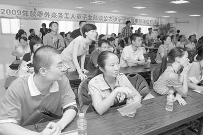 2009年8月26日,福建省廈門市,2009年秋季外來務(wù)工人員子女就讀公辦小學(xué)派位現(xiàn)場,家長焦急地看著派位結(jié)果。廈門市思明區(qū)和湖里區(qū)舉行秋季公辦小學(xué)一年級招收進城務(wù)工人員子女入學(xué)的電腦派位。兩區(qū)共計有3142名進城務(wù)工人員子女被派入公辦小學(xué)。