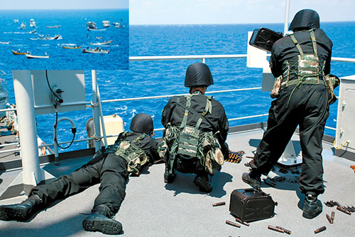 10時05分,“微山湖”艦特戰(zhàn)隊員和反海盜分隊按部署就位。指揮員下令發(fā)射信號彈進行警告,但數(shù)艘可疑快艇繼續(xù)向編隊靠近。10時39分,沖在最前面的幾艘快艇已接近至“微山湖”艦左舷5鏈(925米)處。指揮員果斷下令,使用重機槍進行警告攔阻射擊(見上圖,左上角為可疑快艇)!班睒屄曧懫穑梢煽焱V沽饲斑M,不久便調頭離去!拔⑸胶迸炛匦抡{整航向,于當?shù)貢r間3月21日凌晨將“振華9號”護送至安全海域。