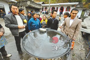納雍縣少數(shù)民族眾多,這對新人都是漢族,新郎叫嚴(yán)大朵,新娘叫榮美翼。為了舉行婚禮,半個多月前,專門在新郎家門口修了一個水池。全家人都省吃儉用,到處找水存進這水池當(dāng)中,村子里其他鄉(xiāng)親也來幫忙。到婚禮舉辦的前一天,兩米見方的水池終于全部裝滿。家里又找了幾口大鐵鍋,裝滿清水備用。