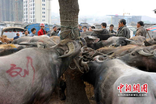 近中午時(shí)間,市場里買賣的人群還未散去。秦大章夫婦牽著剛買的牛回家了,這得花上2、3個(gè)小時(shí)的時(shí)間;氐郊,喂牛的水又是一個(gè)問題,“沒干凈水夠它喝,只能像鄰居那樣把洗菜、洗臉腳的水留下給牛喝!鼻卮笳碌钠拮诱f。雖然羨慕村里有人可以用機(jī)器耕地,但家里的4、5畝地多在石頭叢生的半山腰上,秦家夫婦還是只能選擇最傳統(tǒng)的牛耕方式。