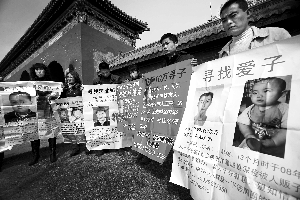 昨日下午2時(shí)許,天壇公園西門附近,10位尋找自己“走失”孩子的父母,舉著大幅的海報(bào),在向過往的市民介紹著孩子失蹤的情況。海報(bào)上,一張張稚嫩活潑的孩子的面孔與這些中年人憔悴的神情形成了鮮明的反差。