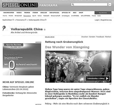 德國(guó)《明鏡》周刊網(wǎng)絡(luò)版以“鄉(xiāng)寧的奇跡”為題,報(bào)道了山西省臨汾市鄉(xiāng)寧縣王家?guī)X煤礦115名礦工成功升井的壯舉。報(bào)道說(shuō):“3000多名救援人員在過(guò)去的幾天里夜以繼日地不間斷救援。為了不讓自己因疲憊倒下,他們將自己用皮帶固定在坑道壁上,渴了就喝坑道冒出來(lái)的水!钡赂鞔竺襟w網(wǎng)絡(luò)版在刊登該消息時(shí)全部引用了擔(dān)任中國(guó)政府礦山安全顧問(wèn)的專家大衛(wèi)·費(fèi)克爾特的話:“這是礦業(yè)歷史上的一次最令人驚嘆的援救行動(dòng)!”
