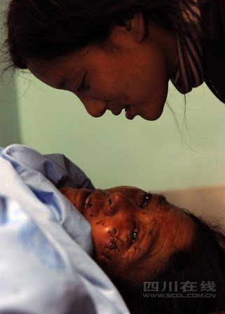 當(dāng)滿載傷員的急救車隊(duì)飛馳在機(jī)場高速時,潘蓮英打開了手機(jī),女兒牟元霞打來電話,“爸爸還好嘛?”“好!我們馬上就到醫(yī)院了!碧稍趽(dān)架上的牟炳學(xué)聽到女兒的問候,再也控制不住自己的情緒,眼淚順著布滿血痂的眼角不停流淌。