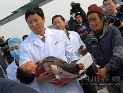 下午5時10分,空運(yùn)到成都的首名傷員被抬上第一輛救護(hù)車,傷員的口、鼻、眼睛布滿了血痂,手腕、手臂上全是傷痕。抬上擔(dān)架后,隨車主治醫(yī)生余海放立即對其測量血壓、心率,詢問有何不適,并進(jìn)行了登記。傷員的右手腕上拴著紅布繩,這是地震災(zāi)區(qū)醫(yī)生經(jīng)過初診后認(rèn)定是重傷員的標(biāo)記。