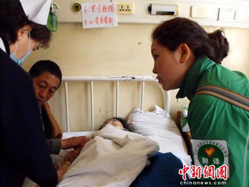 在來自玉樹縣的33歲的央金拉措床前,西北民族大學2009級藏語言文學自考班的學生更求拉吉,自15日晚起,成為“救治青海地震災區(qū)傷員翻譯”志愿者,她跑前跑后的為傷者服務,央金拉措的哥哥用簡單的漢語對記者連聲說,好、好!記者通過更求拉吉了解到,央金拉措他們來自于牧區(qū)很少去醫(yī)院,昨晚一住進醫(yī)院后就暈頭轉向了,幸虧有大學生志愿者為他們提供幫助。(完)