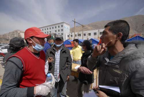 他的名字叫高樹友。在現(xiàn)場(chǎng)負(fù)責(zé)招募志愿者的玉樹團(tuán)州委干事扎西告訴我,地震發(fā)生后幾小時(shí),滿身是土的高樹友跑來了,找到我們要求當(dāng)志愿者!爱(dāng)時(shí)現(xiàn)場(chǎng)還很亂,我們隨便找了一張紙,高樹友寫下了第一個(gè)名字”,扎西從桌上拿出一個(gè)寫滿名字的紙說:“就是這樣的紙,現(xiàn)在已經(jīng)寫滿幾十頁(yè),有400多人報(bào)名了,地震當(dāng)天有30多個(gè)。高樹友不僅是第一個(gè)報(bào)名,而且?guī)椭覀兘M織志愿者,這個(gè)招募點(diǎn)就是我們一起搭起來的!