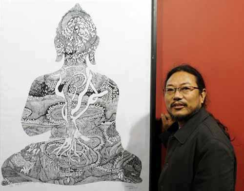 很晚了,我們才坐到飯桌旁,吾要這些天為悼念遇難同胞吃素,不事煙酒,只是溫和地說話。他說世人對佛的理解有偏頗,以為佛無所不能、護佑眾生,而他認為佛的精義在于教人向善、慈悲、寬容。畫展陳列作品的主角是佛陀,是圣山,圣水,圣靈,這些不是神,是心,是偉大的自然之子——人的本身,是人類尊重生命、善待眾生、敬畏自然、愛護環(huán)境的藝術(shù)再現(xiàn)和哲理升華。