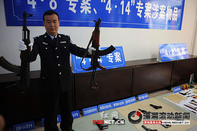 B——4月14日,長沙市公安局雨花分局金桃派出所巡防隊(duì)員查獲8支非法販運(yùn)的槍支,長沙警方在浙江、上海、云南、廣東公安機(jī)關(guān)的協(xié)作下,破獲了一起從境外向“長三角”地區(qū)販運(yùn)槍支的大案。此案繳獲包括殺傷力極大的M16、AK47突擊步槍在內(nèi)的各種軍用槍支13支、子彈305發(fā),抓獲犯罪嫌疑人7人。