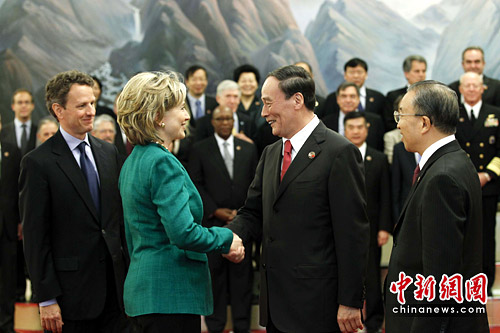 中新網(wǎng)北京5月24日電(記者 張蔚然)第二輪中美戰(zhàn)略與經(jīng)濟(jì)對(duì)話開幕式今天上午9時(shí)許在人民大會(huì)堂舉行。中國國務(wù)院副總理王岐山、國務(wù)委員戴秉國、美國國務(wù)卿克林頓、財(cái)政部長蓋特納出席。