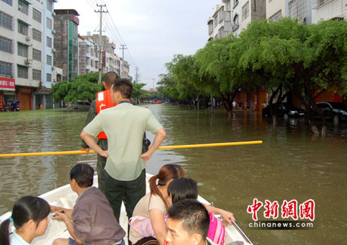 記者在來(lái)賓市實(shí)驗(yàn)中學(xué)看到,該校已成為一片湖泊。水深處約有1.6米,已經(jīng)淹過(guò)成年男子肩膀。水中七零八落飄散著住戶(hù)的生活用品,一樓居民已經(jīng)全部撤離。消防官兵自早上8時(shí)許開(kāi)始對(duì)被困師生進(jìn)行救援,直至下午5時(shí),該校1100名被困師生及家屬全部撤至安全地帶。學(xué)校內(nèi)停電并且無(wú)法出行,影響了不少居民的正常生活。周邊幾家商鋪圍擋自家門(mén)口防止積水流進(jìn)店內(nèi),用各種器皿向外倒水。
