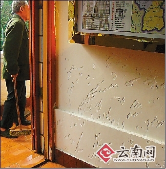 順著老人所指的地方,記者來到了二樓。從樓梯口一直到走廊的盡頭都是濕漉漉的。老人說,走廊上剛剛拖過地,灑著消毒水,因?yàn)榍疤焱砩弦宦范际茄T谧呃缺M頭有一間大門敞開的辦公室,據(jù)介紹這間就是副局長張敢的辦公地點(diǎn)。辦公室的白墻上凹凸不平,老人告訴記者,由于墻面上都是血跡,昨天一早,就有好幾個(gè)工人前來處理,將墻上的鮮血刮得干干凈凈,但即便如此,墻上還是依稀看得見未清理干凈的血印。