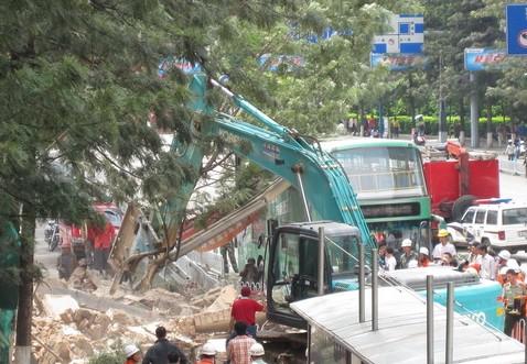 記者現(xiàn)場(chǎng)了解到,今天上午11時(shí)15分左右,云南飯店在拆遷過程中突然發(fā)生倒塌?繓|風(fēng)西路一邊正在被拆遷的一堵高大約7米的墻體砸向公交站臺(tái),一輛5路公交車正在站臺(tái)上下客,由于墻體離公交站臺(tái)非常近,正在下車的兩名乘客(一男一女)被砸傷。隨后,救護(hù)車迅速趕往現(xiàn)場(chǎng),目前,兩名傷者均已被送往醫(yī)院搶救,傷勢(shì)尚不清楚。