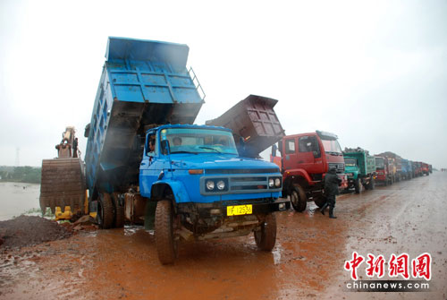 中新網(wǎng)臨川6月24日電(張見(jiàn)悅 劉占昆 何柳斌)江西撫河唱?jiǎng)P段數(shù)百米米決口封堵方案已經(jīng)確定,24日中午,記者在福銀高速撫河大橋看到,大批工程車(chē)輛運(yùn)載石料,準(zhǔn)備鋪就一條運(yùn)輸通道延伸向決口初,決口封堵的外圍工程在雨中開(kāi)始緊張進(jìn)行。