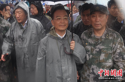 在羅針鎮(zhèn),溫家寶冒雨在羅針鎮(zhèn)高速公路的羅針收費(fèi)站下車,直接到了險(xiǎn)情的岸邊,慰問現(xiàn)場搶險(xiǎn)的人員。他和搶險(xiǎn)的武警官兵親切握手,并即興發(fā)表了講話。