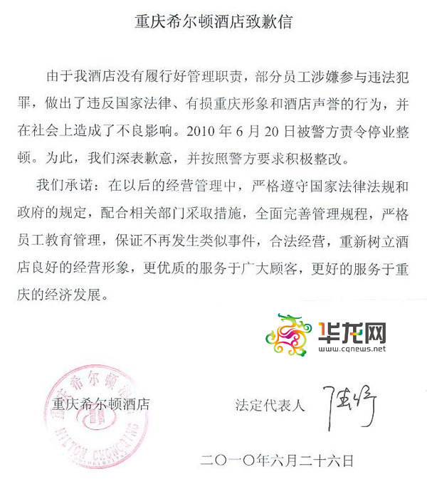 2010年6月20日,重慶希爾頓酒店因股東涉黑,介紹、容留婦女賣淫,違法經(jīng)營(yíng)和故意擾亂社會(huì)秩序,被重慶警方責(zé)令停業(yè)整頓。今日16時(shí)40分,重慶希爾頓酒店法定代表人陸紓,通過(guò)華龍網(wǎng)記者就此事公開發(fā)表致歉信,承諾合法經(jīng)營(yíng),更好地服務(wù)重慶經(jīng)濟(jì)發(fā)展。