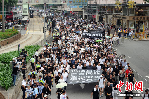 臺灣《中國時報》關(guān)注到,首度攜手舉行跨黨派“無聲游行”,約八萬人參加。在哀樂聲中,游行民眾先為死難者默哀三分鐘,隨即從維多利亞公園出發(fā)游行至遮打花園,并綁上黃絲帶對死者悼念,場面相當(dāng)哀戚。游行途中民眾不呼口號,用沉默展現(xiàn)港人最強烈抗議。