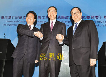 粵港澳三地政府19日在香港舉行共同推進(jìn)實(shí)施《珠江三角洲地區(qū)改革發(fā)展規(guī)劃綱要》聯(lián)絡(luò)協(xié)調(diào)會(huì)議,唐英年、廣東省副省長(zhǎng)萬(wàn)慶良、澳門特區(qū)經(jīng)濟(jì)財(cái)政司司長(zhǎng)譚伯源率領(lǐng)三方官員,就如何落實(shí)《綱要》中有關(guān)粵港澳合作的部分,進(jìn)行深入討論。中聯(lián)辦副主任郭莉也出席會(huì)議。