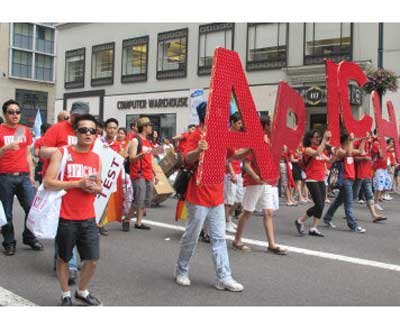 亞裔隊(duì)伍由巨大的彩虹字幅“Asian Pride”打頭陣,數(shù)十人演奏亞洲樂器,吸引民眾注意力,緊隨其后的是專門為亞裔女同志設(shè)立的Q-Wave團(tuán)體!皝喬岚滩÷(lián)盟”(APICHA)主打“免費(fèi)HIV檢測”計(jì)劃,近百位身穿紅色T恤的成員們手舉標(biāo)語,向沿路民眾分發(fā)安全套。