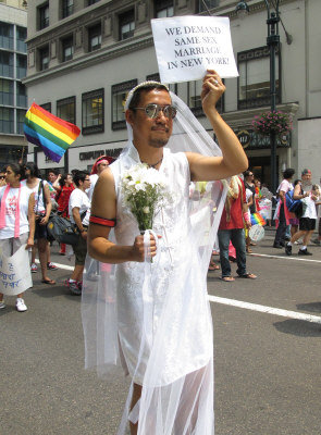 很多亞裔同志勇敢展示自己,其中不乏華裔身影。一位身穿結(jié)婚禮服的亞裔男同志,手舉“要求紐約承認(rèn)同性婚姻”的牌子,表達(dá)了同志們的呼聲。也有不少同志的支持者參加游行,梁淑儀支持身為女同志的姐姐梁淑安一起來游行,當(dāng)義工的劉健行和劉素夫婦表示有很多同志朋友,大家都是一樣的人,沒有什么不同。(劉爽)