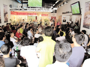 在南非世界杯舉辦期間,紐約華埠和小意大利區(qū)均沾著世界杯的喜氣,不少餐館、酒吧都在比賽時播放賽事,門外還有黑板寫上比賽兩隊介紹!跋愀壅尽笨觳偷晔侨A埠餐飲業(yè)首先這樣做的,餐館內(nèi)張貼了告示:“最低消費4.25元,開賽前30分鐘至散場。”球迷都說值,因此每場賽事均座無虛席。11日荷蘭與西班牙爭桂冠,更加吸引球迷及準球迷,餐廳內(nèi)爆滿,有的站在門外隔著玻璃看賽事,也感到過癮。