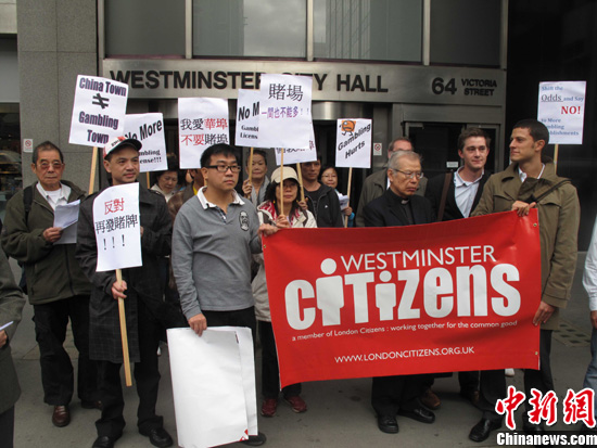 當?shù)貢r間16日,來自“倫敦公民”組織及多個華社的30余人,前往倫敦威斯敏斯特市政府,呼吁政府停止在倫敦華埠附近發(fā)放新的賭博場所牌照,以保持均衡的社區(qū)發(fā)展及健康的唐人街風貌,免使倫敦華埠淪為倫敦“賭埠”。