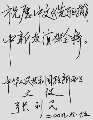 值此建國(guó)60周年之際,謹(jǐn)借《中文先驅(qū)報(bào)》之一隅,向大家的愛國(guó)愛鄉(xiāng)情懷深表贊賞和感謝,祝愿各位在事業(yè)上取得更大成績(jī),為中新友好做出新的貢獻(xiàn)。