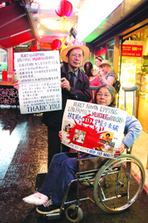 10月25日是悉尼北葉坪滅門慘案百日祭。在瓢潑大雨籠罩下的華埠德信街牌樓附近,林暋的母親朱鳳琴坐在輪椅上,右腳綁縛石膏板,高聲向過路人呼喚,希望關(guān)注林家的悲慘遭遇。