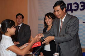 8月31日,漢語征文比賽頒獎儀式在蒙通社新聞中心舉行。駐蒙古使館臨時代辦王?怠⒚赏ㄉ缈偩庉嬘⒌侠、《蒙古消息報》主編包勒爾出席,并為獲獎?wù)哳C獎。此次比賽時間雖短,但收到了近30篇作品,共評出1個一等獎、1個二等獎和5個三等獎。獲得一等獎的是蒙古國友誼學(xué)校8年級學(xué)生烏音嘎,獲得二等獎的是今年剛畢業(yè)于上海一所大學(xué)的蒙古留學(xué)生尼亞木巴雅爾。